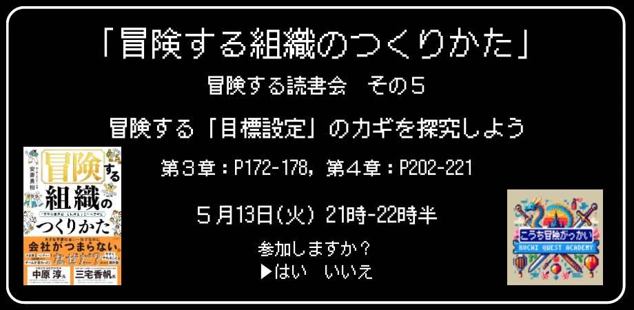 5/13 【冒険する読書会その5】安斎勇樹『冒険する組織のつくりかた』第3・4章~冒険する「目標設定」のカギを探究しよう~